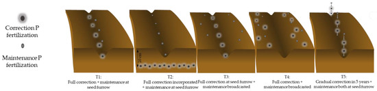 The phosphate fertilizer management for soil P buildup was evaluated during six consecutive years (2014/15 to 2019/20), and consisted of five combined modes of applying phosphate fertilizer (correction—phosphate recommendation to buildup soil P levels; maintenance—phosphate recommended for annual crop production): T1: full correction + maintenance applied at seed furrow (considered as a control treatment); T2: full correction incorporated by plowing (0–20 cm) + maintenance at seed furrow; T3: full correction at seed furrow + maintenance broadcasted in soil surface; T4: full correction + maintenance both broadcasted in the soil surface; T5: gradual correction throughout five years + maintenance both at seed furrow. The illustration of the treatments can be seen in Figure 1.