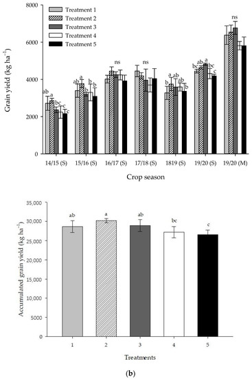 (a) Grain yield in each season; (b) Accumulated grain yield in six years of cultivation. S: soybean; M: maize; Treatment 1: full correction + maintenance at seed furrow; Treatment 2: full correction incorporated + maintenance at seed furrow; Treatment 3: full correction at seed furrow + maintenance broadcasted; Treatment 4: full correction + maintenance both broadcasted; Treatment 5: gradual correction + maintenance at seed furrow. Means followed by different letters differ by Tukey test at 10% error probability; ns: not significant. Error bars (±) indicate the standard deviations of 3 replicates.