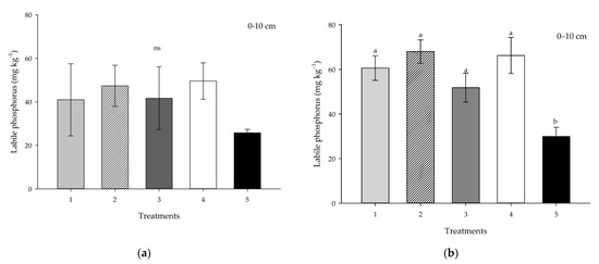 Gradual P buildup at seed furrow (T5) resulted in lower labile P in the 0–10 cm layer after six years of application (Figure 3b). In this management, an amount of P greater than crop requirement (P extraction and exportation) was applied at seed furrow annually, aiming at the gradual P accumulation in the soil, potentially reaching the desired P availability after a few years [25]. However, although the full amount applied was the same after six years, the content of labile P in the soil was not. Possibly, the crop rows rarely overlapped perfectly for two or more crop seasons, so this application may have contributed to increasing P fixation into the soil components (1:1 clay and Fe oxi-hydroxides). Concentrating most P in specific rows/depths does not improve the overall labile P concentration [8,12].