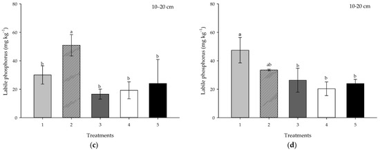 Labile phosphorus in the soil after three (a,c) and six years (b,d) of the experiment establishment, at 0–10 and 10–20 cm layers. Treatment 1: full correction + maintenance at seed furrow; Treatment 2: full correction incorporated + maintenance at seed furrow; Treatment 3: full correction at seed furrow + maintenance on broadcast; Treatment 4: full correction + maintenance both broadcasted; Treatment 5: gradual correction + maintenance at seed furrow. Means followed by different letters differ by Tukey test at 5% probability; ns: not significant. Error bars (±) indicate the standard deviations of 3 replicates.