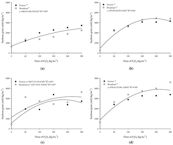 The increase in grain yield as function of P doses (P2O5) was applied and adjusted to a quadratic model for all evaluated seasons, regardless of application mode, seed furrow, or broadcasted (Figure 4). Except for the 2014/15 and 2019/20 soybean seasons, the estimated dose for the highest yield was nearly 250 kg ha−1 of P2O5. In the first season (2014/15), the dose for highest grain yield was very high (Figure 4a) due to the low original available P content in the soil (Table 1); in the 2019/20 season, the required dose for maximum yield was also higher, probably due to more P demand by plants (Figure 4f). As the dose of P increased, the cost of P fertilizer proportionally increased. However, it also increases the grain yield, which resulted in greater profit per hectare (Table S2) up to the maximum economical return dose.