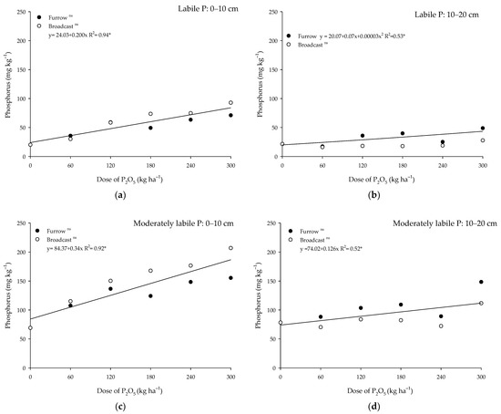 When considering the accumulated production, maximum grain yield should be obtained under 266 kg ha−1 of P2O5, regardless of the application mode (Figure 4h). Similar results were reported by Moreira et al. [27] in an opening Cerrado area (268 kg ha−1 of P2O5), evaluating two seasons of soybean. Sousa and Lobato [28] observed the largest increments with P fertilizer doses between 60 and 280 kg ha−1 of P2O5. In addition, Fageria et al. [29] reported that the annual dose of 120 kg ha−1 of P2O5 was the most responsive for grain yield when broadcasted without incorporation, although the authors did not evaluate higher doses than that. Carvalho et al. [30] observed maximum grain yield (average of two crop seasons) of the common bean under 239 kg ha−1 of P2O5 in Mozambique (similar conditions of climate and soil as the Cerrado Region of Brazil). On the other hand, Mariussi et al. [31] verified that in soils with high fertility, soybean plants did not respond to P application (up to 280 kg ha−1 of P2O5). In sugarcane, corrective (150 kg ha−1 P2O5 broadcast and incorporated) and maintenance P (40 kg ha−1 P2O5 per year) fertilization should be always considered due to the higher yield response over the cultivation cycles [32].