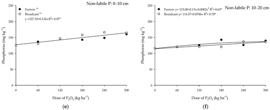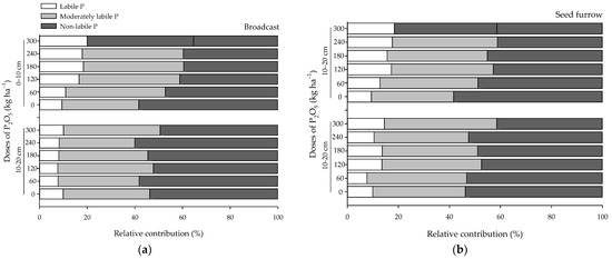 The labile and moderately labile P fractions relative to the total P in the soil increased proportionally to the increase in P doses applied, which was more evident at 0–10 cm, but was also detected at 10–20 cm (Figure 5a–d and Figure 6). Considering the average of P application mode (seed furrow or broadcast), labile P (PiAER + PiBIC + PoBIC) represented 9.4 to 20.1% of the soil total P at 0–10 cm, and 9.6 to 12.3% at 10–20 cm, for doses from 0 to 300 kg ha−1 of P2O5, respectively. Moreover, the moderately labile P fraction (PiHID-0.1 + PoHID-0.1 + PHCl) represented 32.1 to 42.4% of the soil total P at 0–10 cm and 33.5 to 41.9% at 10–20 cm, which was also contrasted according to the doses from 0 to 300 kg ha−1 of P2O5, respectively. Those results are in accordance with Rodrigues et al. [3], in which the labile P represented <20% of total P and moderately labile varied from 27 to 36% in cultivated areas of Brazilian Cerrado. Otherwise, higher doses of P resulted in lower proportions of soil non-labile P fractions (PiHID-0.5 + PoHID-0.5 + Presidual) relative to the total P (Figure 5e,f). The non-labile P constituted the greatest proportion, representing 38.5 to 58.5% at 0–10 cm and 45.8 to 56.9% at 10–20 cm, with a small but significant increment according to increasing P fertilizer dose. Similarly, other authors [3,34,35] verified that non-labile P fractions constituted the largest fraction of the total P in the soil, representing, in general, more than 50% of the total P.