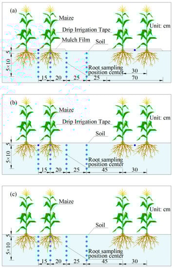 The corn roots were sampled using the root auger method at the time of jointing and tasseling in 2016 at a soil depth of 0–60 cm. The root sampling points for each irrigation method are shown in Figure 3a. Three replicates were collected each time. The extracted corn roots were soaked in water for 24 h and then picked out using a 0.5 mm sieve. The corn roots were dried at 65 °C to a constant weight. They were then spread on white paper with a 20 cm control line and photographed. The root length was calculated using R2v and Photoshop software and divided by the volume of each soil sample at different layers to obtain the root length density.