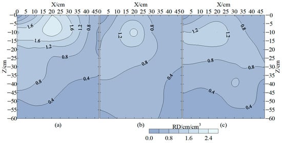 Root length density distribution map. (a) Mulched drip irrigation; (b) shallow-buried drip irrigation; (c) sprinkler irrigation.
