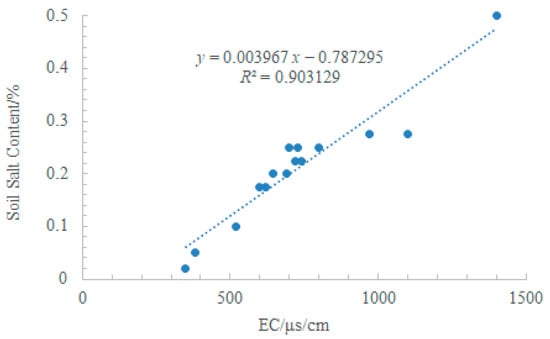 The drying method was used to measure the soil water content. A typical location was selected for the three distinct irrigation technology test areas. The sampling depths were 10 cm, 30 cm, 50 cm, and 70 cm, and measurements were made every 14 days. The dry residue method was used to calibrate the relationship between soil salt content and conductivity. Soil samples were crushed and then passed through a 1 mm sieve. Twenty grams of soil were weighed and then placed into a triangular flask. A volume of 100 mL of distilled water was added, and the flask was shaken for 30 min using a shaker. Filtering was carried out after 10 min standing to obtain leachate with a water-to-soil ratio of 5:1. The standard curve and formula between soil salt content and electrical conductivity are shown in Figure 4. The conductivity of the leachate was determined using a conductivity meter (Shanghai Leici DDS-11A, Shanghai, China). After the end of the fertility period, undisturbed soil samples were taken from depths of 10 cm, 30 cm, 50 cm, and 70 cm. The soil hydraulic parameters were measured using a 1500 F1 pressure membrane instrument (Soilmoisture Equipment Corp., Goleta, CA, USA). Repeat sampling was carried out six times for each irrigation technology.
