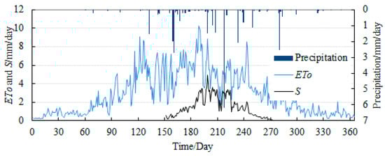 The experiment was conducted from May to October 2016 in the Horqin Left Middle Banner (Figure 1, a central coordinate of 122°21′38″ E, 44°11′09″ N) on the southeastern edge of the Greater Khingan Range, a transition zone from the Songliao Plain to the Inner Mongolia Plateau. The ground elevation is between 120 m and 230 m. It has a north-temperate continental monsoon climate. The multi-year average temperature is 5.2–5.9 °C, with a maximum temperature of 40.9 °C and a minimum temperature of −33.9 °C. The accumulated temperature ranges from 3042.8 to 3152.4 °C. The multi-year average precipitation tends to increase from northwest to southeast, ranging from 342 mm to 392 mm, with uneven intra-annual distribution and significant interannual variations. The multi-year average maximum wind speed is 15.6 m/s, with a maximum instantaneous wind speed of 29 m/s and an average wind speed of less than 3.4 m/s during the irrigation season. Day-by-day rainfall and evapotranspiration data are shown in Figure 2.