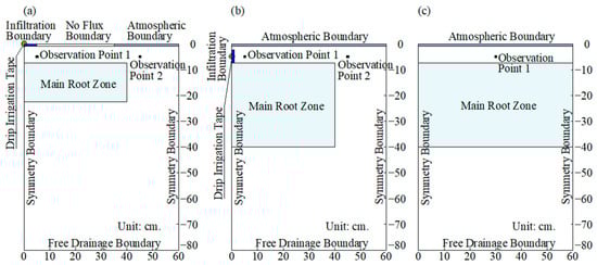 Schematic of soil water and salt transport simulation model. (a) Mulched drip irrigation; (b) shallow-buried drip irrigation; (c) sprinkler irrigation.