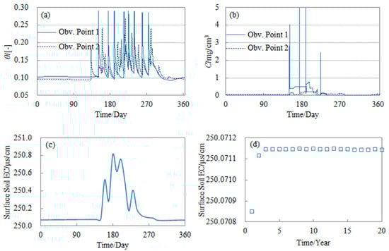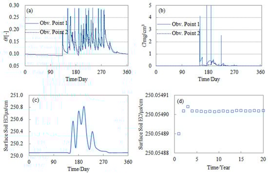 The simulation results showed similar distributions of water and salt in the soil under MDI and SBDI. The soil water content changes at point 1 under MDI and SBDI were primarily influenced by irrigation (Figure 7a and Figure 8a). They were mainly due to the small distance between point 1 and the drip tape, which resulted in a sharp increase in soil water content after irrigation. In addition, the drip irrigation with a low flow rate and a high frequency had a greater water supply in the shallow area below the drip tape [32,33]. point 2 was located on the bare ground outside the mulch. The soil water content at point 2 was influenced by irrigation and closely correlated with rainfall. The trends in soil solution concentrations at monitoring points 1 and 2 were generally consistent. The soil solution concentration was mainly affected by fertilization and was higher in the fertility period but lower in the non-fertility period. This was mainly due to the drip irrigation and fertilization method, as it can directly deliver a precise water and fertilizer amount to the crop root zone according to the crop demands. In addition, it can infiltrate the most developed areas of the root system and maintain optimum water and nutrient content in the active root zone [34]. As a result, the soil solution concentration decreased significantly in the crops’ non-fertility period without irrigation and fertilization. This result was consistent with the findings of Berrada et al. [35] and other scholars. The point source nature of drip irrigation is due to its shallow and frequent irrigation features and its small humid area. Salt is transported with the water to the edge of the wetted zone and then a desalination zone is formed near the center of the drip head [36,37]. Many studies have shown that drip irrigation is essential for improving saline soils. The findings that the soil water content increased with the increasing distance from the drip tape and that soil salinity became greater with the increasing distance from the drip tape were consistent [38,39]. Soil salt mainly accumulates at the edge of wet soil, resulting in the distribution of low soil salt inside the mulch and high soil salt between the mulches [36,40]. The relatively low soil salinity in the desalination area can provide a favorable environment for plant root growth and water absorption.