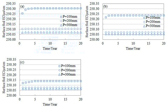The results of the experiments and simulations in Figure 7, Figure 8 and Figure 9 showed that the change patterns of soil solution concentration and salinity were influenced by irrigation and rainfall. To clarify the effect of meteorological changes on water and salt transport in soil, three different rainfall scenarios of P = 300 mm, P = 200 mm, and P = 100 mm were set. The effect of rainfall on the changes in salt content in the topsoil (5 cm) in the test area under MDI, SBDI, and SI was simulated for 20 years, and the simulation results are shown in Figure 10.