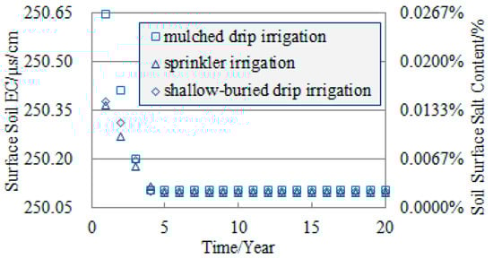 Salt transport in the soil is influenced not only by irrigation technologies, irrigation volumes, and meteorological conditions, but also by soil conditions. To evaluate the effect of irrigation technology in saline soils, this study set the initial EC value as 480 μs/cm (soil salt content 0.1%). It simulated the water and salt distribution in soil with MDI, SBDI, and SI under real meteorological and field conditions in the test area. The simulation period was 20 years, and the results are shown in Figure 11.