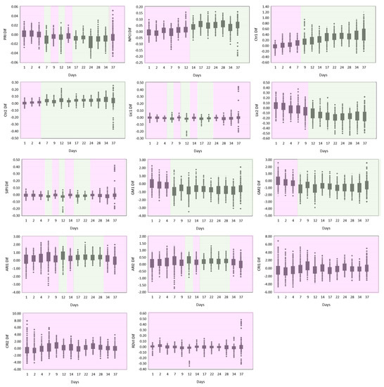 Differences between vegetation index values determined in treatments with watering to 80% and 40% field capacity, along the 37 days of the experiment (day 1 corresponds to the start of the application of the different watering regimes), in box and whiskers graphics. The “box” includes differences between the 1st and the 3rd quartile. The pink background is used for the period with no significant differences in the index’s values, whereas the green background represents the period when differences were significantly different from zero. Each day of the graphic includes 400 differences calculated between the 20 replicates of the different water regimes.
