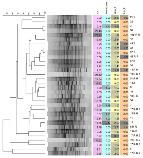Dendrogram of M13 PCR-fingerprint profiles of 32 isolates obtained from the rhizosphere of tomato watered to 40% field capacity (the scale represents the similarity based on Pearson correlation coefficient and UPGMA). Different plant growth-promoting attributes are represented by a different color and darker grey intensity corresponds to higher production or activity; average values of IAA production (µg IAA mg−1), of indices of phosphate solubilization and mineralization and siderophore production (calculated as colony diameter + halo zone diameter)/colony diameter) are indicated (n = 3).