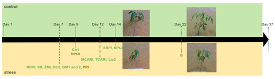 Timeline of the tomato plant experiment, showing when the indices became significantly different between the two treatments (watering to 80% and 40% of soil field capacity). “Green” indices indicate significance from that day on, while “gold” indices indicate that although the indices became significantly different between treatments, the significance was not consistent until day 37. Photos of representative plants from each treatment, taken during the experiment, are included.