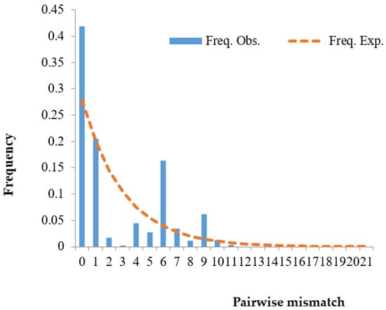 Mismatch distribution of the Colletotrichum gloeosporioides population from Citrus in China. Exp stands for expected value and Obs stands for observed value.