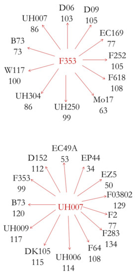 We evaluated two Nested Association Mapping (NAM) designs that were described by Bauer et al. []. Briefly, the central Flint line UH007 was crossed with 11 Flint founder lines, and the central Dent line F353 with nine Dent founder lines. In addition, each of the central lines was crossed with B73 and with the founder of the reciprocal NAM population, i.e., F353 × UH007 and UH007 × F353, in order to connect the two panels with each other and with the US NAM population []. Therefore, we obtained 24 DH populations containing from 35 to 129 DH lines (Figure 1) []. The parental inbred lines and the parents represent the diversity of the flint and dent groups adapted to Europe. Altogether, there were 919 DH inbred lines for the Dent, and 1009 for the Flint available for this study.