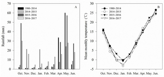 Rainfall (A) and mean monthly temperature (B) during the wheat growing season (from the initial year in October to the next year in June).