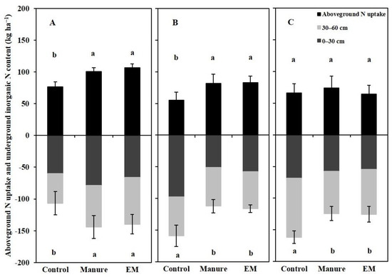 Third, increasing yields by improving SOC content contributes to fast-growing plants and effectively exploits available soil N resources [34]. In this study, DM accumulation and aboveground N uptake before GS61 were significantly higher than that of the Control treatment (Table 5 and Figure 2), indicating that improving SOC contributed to wheat growth in the early growing period. These results are consistent with previous findings that showed that increased grain yield is related to the increasing pre-anthesis assimilate, which can be beneficial to grain filling and greater dry matter translocation efficiency [35]. Meanwhile, the EM and Manure treatments had lower residual soil Nmin content in the root zone (Figure 2), which reduced the likelihood of N losses, especially via leaching under the irrigated conditions seen in this region [16,36].