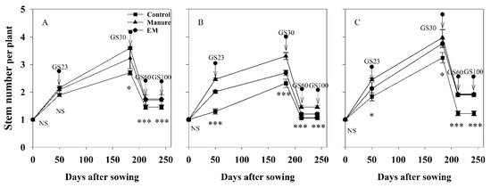 The dynamic of stem number of individual plant across three years. (A–C) means 2015, 2016, and 2017, respectively. Vertical bars represent ± S.E. of the mean. GS23, GS30, GS60, GS100 before the winter, start of stem elongation, beginning of anthesis, and physiological maturity stages, respectively. NS, not significant; * Significant at p < 0.05; *** Significant at p < 0.001.
