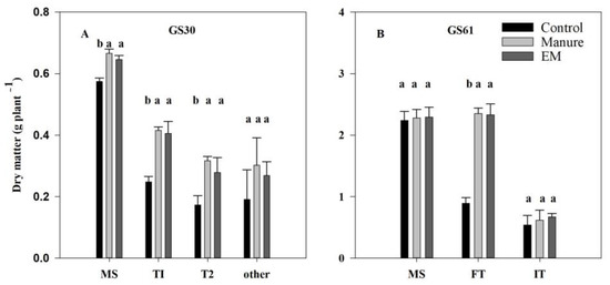 The shoot numbers for the EM and Manure treatments, which have the same seeding rate, were 2.1 and 2.3 shoots/plant–1 before winter, representing increases of 25.5% and 39.6%, respectively, compared to the Control treatment (1.7 shoots plant–1; Figure 3). At the GS30 stage, the EM and Manure treatments had an average of 3.4 and 3.5 shoots/plant–1, respectively, much higher than those of the Control (2.8 shoots plant–1) over the 3-year study period (Figure 3). The DM of the MSs for the EM and Manure treatments were 12.5% and 15.9%, respectively, significantly higher than that of Control, and 63.6% and 67.3% for T1, and 61.5% and 83.4% for T2, respectively (Figure 4A). At GS61, 1.6 and 1.7 shoots/plant−1 were observed for the EM and Manure treatments, representing increases of 29.5% and 36.8%, respectively, compared to the value of 1.2 shoots/plant−1 for the Control treatment (Figure 3). The DM of the VTs for the EM and Manure treatments were 2.3 and 2.4 g/plant−1, which was 163.8% and 161.5% higher, respectively, compared to the Control over the 3-year study period (Figure 4B).