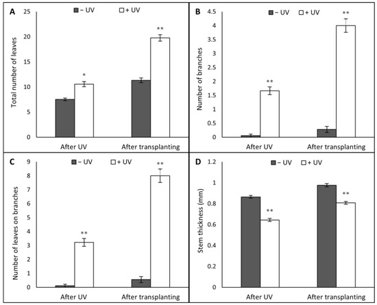Parameters measured were the total number of leaves (A), the number of branches (B), the number of leaves on branches (C) and stem thickness (mm) (D). Before the UV exposure stage, the mean of the total number of leaves was equal to 6, the number of branches and the number of leaves on branches was equal to 0, while the stem thickness was 0.558 mm. Asterisks indicate a significant difference between the UV treatments with p < 0.05 (*) or p ≤ 0.001 (**).