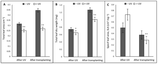 Parameters measured were leaf area (cm2) (A), leaf dry weight (LDW, mg) (B) and specific leaf area (SLA, cm2 mg−1) (C). Before the UV exposure stage, the mean of the total leaf area was 0.216 cm2, the LDW was 0.638 mg, and the SLA was 0.451 cm2 mg−1. Asterisks indicate a significant difference between the UV treatments with p < 0.05 (*) or p ≤ 0.001 (**).