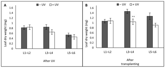 The parameter measured was the leaf dry weight (LDW, mg) across leaf L1–L2, L3–L4, and L5–L6 after the UV (A) or after transplanting (B). Before the UV exposure stage, the mean of the LDW for L1–L2 was 0.876 mg, for L3–L4 was 0.708 mg and for L5–L6 was 0.170 mg. Asterisks indicate a significant difference between the UV treatments with p ≤ 0.001 (**).
