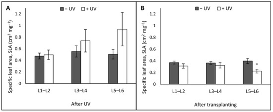 The parameters measured were the leaf specific area (SLA, cm2 mg−1) across leaf L1–L2, L3–L4, and L5–L6 after the UV (A) or after transplanting (B). Before the UV exposure stage, the mean of the SLA for L1–L2 was 0.406 cm2 mg−1, for L3–L4 was 0.470 cm2 mg−1 and for L5–L6 was 0.493 cm2 mg−1. Asterisks indicate a significant difference between the UV treatments with p < 0.05 (*).