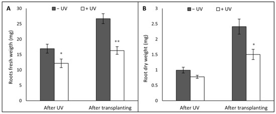 Parameters measured were root fresh weight (mg) (A) and root dry weight (mg) (B). Before the UV, the mean of the root fresh weight was 8.00 mg while the mean of the root dry weight was 0.54 mg. Asterisks indicate a significant difference between the UV treatments with p < 0.05 (*) or p ≤ 0.001 (**).
