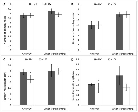 Parameters measured were the number of primary roots (A), the number of secondary roots (B), primary roots length (cm) (C) and secondary roots length (cm) (D). Before the UV exposure stage, the mean number of primary roots was 3.8, the mean of the number of secondary roots was 6.85 while the mean length of the primary roots was 2.47 cm, and the mean length of the secondary roots was 0.80 cm. Asterisks indicate a significant difference between the UV treatments with p < 0.05 (*).