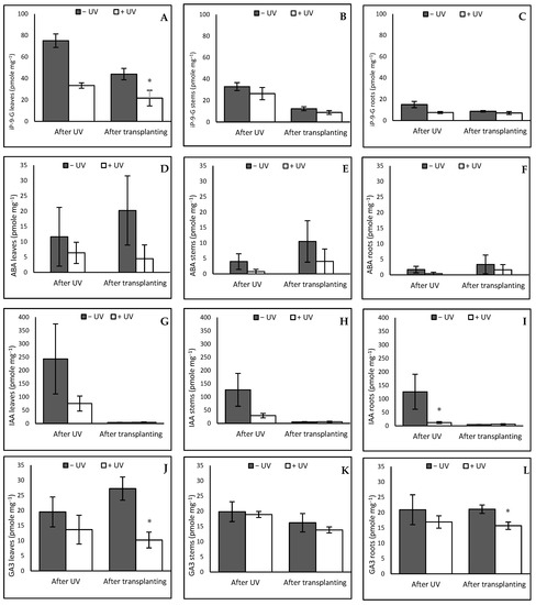 In the graphs are represented the level of hormones IPG9 (A–C), ABA (D–F), IAA (G–I) and GA3 (J–L). Hormones were measured respectively in the leaves (graphs on the left), in the stems (graphs in the middle) and in the roots (graphs on the right). Asterisks indicate a significant difference between the UV treatments with p < 0.05 (*).