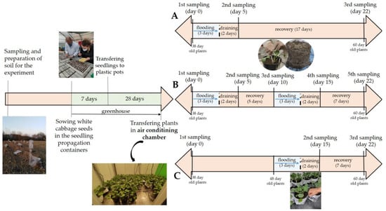 Experimental set-up with three different waterlogging regime treatments: Treatment 1: set-up in which the white cabbage plants were waterlogged once at the early growth stage (A). Treatment 2: set-up in which the white cabbage plants were waterlogged twice (B). Treatment 3: set-up in which the white cabbage plants were waterlogged once at the later growth stage (C). The experiment was conducted under controlled conditions in the growth chamber.