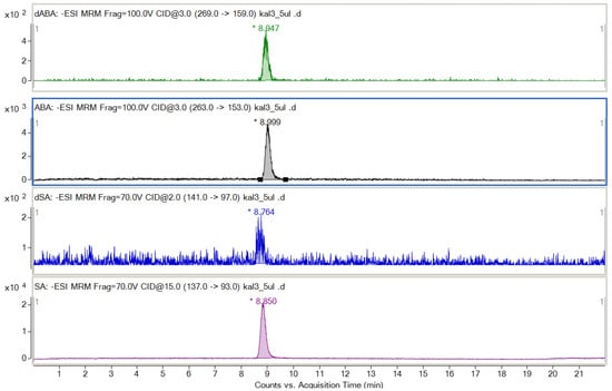MRM chromatograms of calibrant 3 with ABA (black) and SA (purple) concentrations of 480 ng mL−1 spiked with isotopic labeled standards ABA-d6 (green) and SA-d6 (blue), * p value < 0.05.