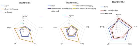 The effect of waterlogging stress on the photosynthetic performance of the white cabbage plants was evaluated by measuring various chlorophyll fluorescence parameters. This included nine chlorophyll fluorescence traits, namely, (CFT)- Fv/Fm, PSII (Fq′/Fm′), ETR, NPQ, qP, qN, qL, φno, and φnpq, and eleven multispectral traits (MST)—Red, Green, Blue, Hue, Saturation, Value, SpcGrn, FarRed, Nir, ChlIdx, and AriIdx, which are listed and explained in the Supplementary Materials (Tables S1–S4). The effect of waterlogging on the changes of these parameters was observed for only five of the abovementioned CFT traits: (i) effective quantum yield of PSII (Fq’/Fm’), (ii) electron transport rate (ETR), (iii) non-photochemical quenching (NPQ), (iv) coefficient of non-photochemical quenching (qN), and (v) quantum yield of regulated non-photochemical energy loss in PSII (ɸnpq). The results for these parameters are presented in Figure 3, for all three treatments, in the form of normalized values of selected CFT. All values represent percentages of values obtained for control plants, enabling comparison of the variables measured on different scales. Conversely, for parameters Fq′/Fm′ and ETR, a negative effect on the plants’ photosynthetic performance was displayed after waterlogging in Treatment 1 as a decrease in the CFT values in this time point; for parameters NPQ, qN, and PSII (ɸnpq) a negative effect was displayed as an increase after waterlogging in the measured values (Figure 3). However, changes within these parameters were not found to be significant. Both Treatments 2 and 3 showed no clear effect of the second waterlogging and waterlogging of the plants at the later growth stage on the CFT parameter (Figure 3).