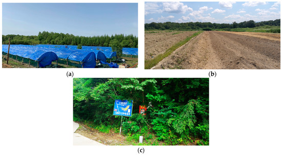 Pictures of the native and vegetated plant communities of soil samples. (a) Picture of the CH and CD collection place. (b) Picture of the CK collection place. (c) Picture of native and vegetated plant communities. CH—biennial ginseng seedlings that were transplanted and then continuously cropped for four years in healthy ginseng rhizosphere woodland soil, CD—biennial ginseng seedlings that were transplanted and then continuously cropped for four years with severe soilborne disease in ginseng rhizosphere woodland soil, CK—soil sample from woodland without ginseng planting.