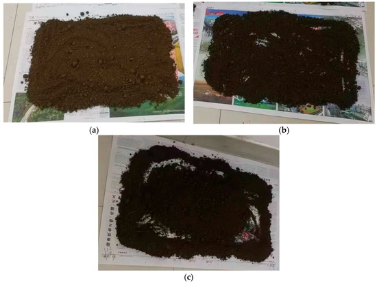 Pictures of soil samples. (a) Picture of soil sample CH. (b) Picture of soil sample CD. (c) Picture of soil sample CK. CH—biennial ginseng seedlings that were transplanted and then continuously cropped for four years in healthy ginseng rhizosphere woodland soil, CD—biennial ginseng seedlings that were transplanted and then continuously cropped for four years with severe soilborne disease in ginseng rhizosphere woodland soil, CK—soil sample from woodland without ginseng planting.