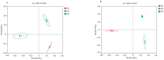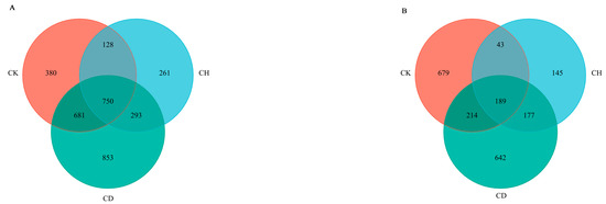In this study, 455,749 and 503,096 sequences were obtained from bacteria and fungi, respectively. There were, on average, 34,808 and 47,479 effective sequences per bacterial and fungal sample, respectively. The average fragment lengths of bacteria and fungi were 414 bp and 242 bp, respectively. In total, 3346 bacterial OTUs and 2089 fungal OTUs were obtained (Figure 4A,B). Additionally, 1939, 1432, and 2577 bacterial OTUs were obtained for the CK, CH, and CD treatments, respectively, with 750 OTUs common to all three samples. In contrast, 1125, 554, and 1222 fungal OTUs were obtained for the CK, CH, and CD treatments, respectively, with 189 OTUs common to all three samples.