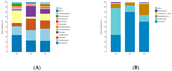 Using the Bray–Curtis distance algorithm, an OTU-level UPGMA cluster analysis was carried out on the distance matrix of the bacterial and fungal communities. The samples were clustered using the average value, and OTUs with abundances less than 5% were merged with others. The results showed that the bacterial and fungal communities in CK, CH, and CD were significantly different. The diversity of the bacterial community in CH was the highest, and the diversity of the fungal community in CD was the highest (Figure 10A,B). CK and CD had a high level of similarity in the bacterial community, and CH and CD had a high level of similarity in the fungal community.