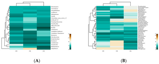 Heatmaps of soil bacterial and fungal communities at the genus level in the different soil samples. (A) Heatmap of the bacterial community at the genus level. (B) Heatmap of the fungal community at the genus level. The relative abundance in each sample was calculated on the basis of the percentage of the total effective sequences, which were classified using the RDP classifier and compared with the Silva database and the UNITE gene database. CH—biennial ginseng seedlings that were transplanted and then continuously cropped for four years in healthy ginseng rhizosphere woodland soil, CD—biennial ginseng seedlings that were transplanted and then continuously cropped for four years with severe soilborne disease in ginseng rhizosphere woodland soil, CK—soil sample from woodland without ginseng planting.