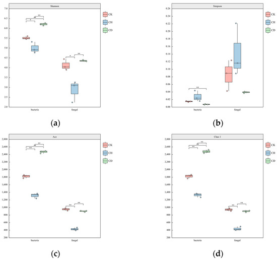 Boxplots of the alpha diversity of bacteria and fungi in the rhizosphere soil of the three samples. (a) Shannon index of bacteria and fungi in the rhizosphere of the three samples. (b) Simpson index of bacteria and fungi in the rhizosphere of the three samples. (c) ACE index of bacteria and fungi in the rhizosphere of the three samples. (d) Chao 1 index of bacteria and fungi in the rhizosphere of the three samples. CH—biennial ginseng seedlings that were transplanted and then continuously cropped for four years in healthy ginseng rhizosphere woodland soil, CD—biennial ginseng seedlings that were transplanted and then continuously cropped for four years with severe soilborne disease in ginseng rhizosphere woodland soil, CK—soil sample from woodland without ginseng planting; * represents a significant correlation (p < 0.05), whereas ** represents an extremely significant correlation (p < 0.01).
