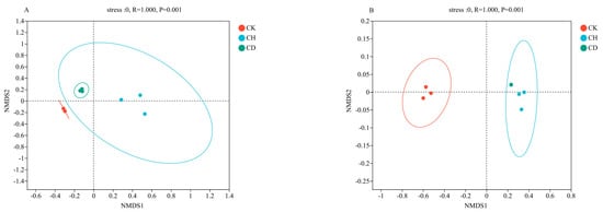 Based on the OTU annotation results, the bacterial communities and fungal communities of the three samples were analyzed by nonmetric multidimensional scaling (NMDS) using the Bray–Curtis distance algorithm. The differences in bacterial and fungal community composition among CK, CH, and CD were studied using NMDS (Figure 9A,B). The results showed that there were significant differences in the bacterial and fungal microbial communities among the three samples (bacteria: R = 1.000, p = 0.001; fungi: R = 1.000, p = 0.001), and the stress values were all 0, indicating that continuous cropping and soilborne disease can significantly affect the microbial community composition in the soil.