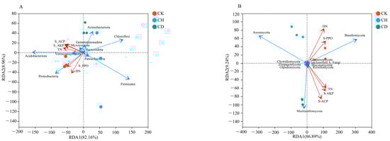 Correlations between bacterial and fungal phyla, soil physicochemical properties, and enzyme activities. (A) Results of the redundancy analysis (RDA) of the top 10 bacterial phyla, soil physicochemical properties, and soil enzyme activities. (B) Results of the RDA of the top 10 fungal phyla, soil physicochemical properties, and soil enzyme activities. CH—biennial ginseng seedlings that were transplanted and then continuously cropped for four years in healthy ginseng rhizosphere woodland soil, CD—biennial ginseng seedlings that were transplanted and then continuously cropped for four years with severe soilborne disease in ginseng rhizosphere woodland soil, CK—soil sample from woodland without ginseng planting. TN—total nitrogen, HN—hydrolyzable nitrogen, S-ACP—soil acid phosphatase activity, S-AKP—soil alkaline phosphatase activity, and S-PPO—soil polyphenol oxidase activity.