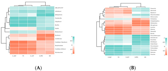 The correlation heatmap shows the relationship between the top 30 genera of bacteria, soil physicochemical properties, and enzyme activities (Figure 12A). The environmental factors HN and S-PPO showed a significant positive correlation with Bryobacter and Acidothermus. The environmental factors S-ACP, TN, and S-AKP were significantly positively correlated with Candidatus Solibacter, Mycobacterium, Candidatus Udaeobacter, and Bradyrhizobium. The environmental factor HN was significantly negatively correlated with Arthrobacter. The environmental factor S-PPO was significantly negatively correlated with Arthrobacter and Sphingomonas. The environmental factors S-ACP, TN, and S-AKP showed significant negative correlations with Bacillus, Chujaibacter, and Paenibacillus. The correlation heatmap showed the relationship between the top 30 genera of fungi, soil physicochemical properties, and enzyme activities (Figure 12B). The environmental factors HN and S-PPO showed significant positive correlations with Oidiodendron, Cladophialophora, and Microglossum, and the environmental factor S-PPO showed a significant positive correlation with Trichoderma. The environmental factors S-ACP, TN, and S-AKP were significantly positively correlated with Russula, Tomentella, Lactarius, and Sebacina; the environmental factor S-ACP was significantly positively correlated with Hypomyces; and the environmental factor TN was significantly positively correlated with Microglossum. The environmental factors HN and S-PPO showed significant negative correlations with Penicillium, Schizothecium, Paracylindrocarpon, Cladorrhinum, and Gibellulopsis. The environmental factors TN and S-AKP showed significant negative correlations with Chaetomium, Neocosmospora, Saitozyma, Trichocladium, and Fusarium. The environmental factor S-AKP showed significant negative correlations with Chaetomium, Trichocladium, and Neocosmospora.