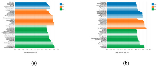 LDA scores of the differentially abundant taxa. (a) Taxa enriched in bacterial microbiota from CK, CH, or CD are indicated with LDA scores (taxa with relative abundances >0.001 and LDA scores >4 are shown). (b) Taxa enriched in fungal microbiota from CK, CH, or CD are indicated with LDA scores (taxa with relative abundances >0.001 and LDA scores >4 are shown). CH—biennial ginseng seedlings that were transplanted and then continuously cropped for four years in healthy ginseng rhizosphere woodland soil, CD—biennial ginseng seedlings that were transplanted and then continuously cropped for four years with severe soilborne disease in ginseng rhizosphere woodland soil, CK—soil sample from woodland without ginseng planting.