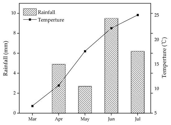 Rainfall and temperature of experimental site. Mar: March, Apr: April, Jun: June, Jul: July.