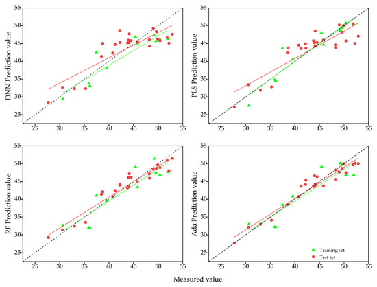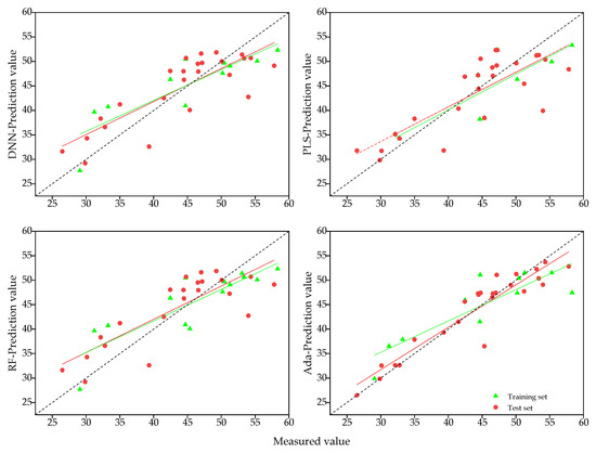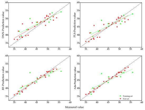 The accuracy of SPAD estimation models for 21 d after wheat heading stage was shown in Table 6 and Figure 6. The R2 of training set and test set of all four models were above 0.65, with the training set accuracy of the DNN and PLS models higher than the test set, while the training set accuracy of the RF and Ada models were lower than the test set. The accuracy of different models, from largest to smallest, was DNN > RF > Ada > PLS. The R2 value of the DNN test set model was 0.737, the RMSE was 4.806, and the MAPE was 0.086, which were 12.18%, 1.80%, and 5.74% higher than the R2 values of the PLS, RF, and Ada models, respectively. The RMSE was 12.41%, 2.42%, −11.02%, and the MAPE decreased by 28.33%, 18.10%, and −4.88%. Based on this analysis, it can be concluded that the DNN model was the most accurate and stable in estimating the SPAD values of wheat 21 d after heading stage.
