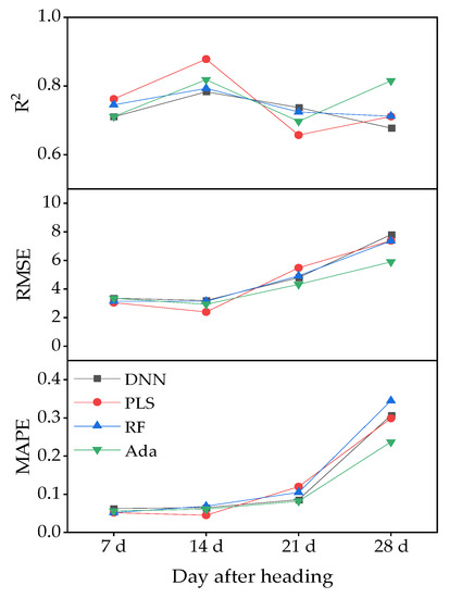 As the growth process progressed, the accuracy of the four models demonstrated an overall trend of increasing then decreasing and then increasing again. The optimal model for estimating SPAD values varied depending on the growth stage (Figure 8). The model with the highest R2 value at 7 and 14 days after heading was PLS, the model with the highest R2 value at 21 d after heading was RF, and the model with the highest R2 value at 28 d after heading was Ada. The model with the lowest RMSE value at 7 and 14 days after heading was PLS, and the model with the lowest RMSE value at 21 and 28 days after heading was Ada. The model with the lowest MAPE value at 7 days after heading was PLS and RF, the lowest at 14 days after heading was PLS, and the lowest at 21 and 28 days after heading was Ada.