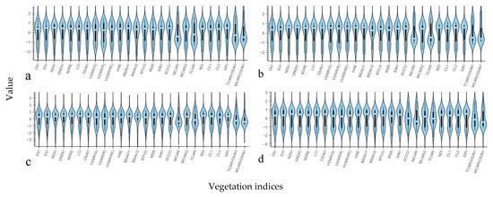 Violin plots of the spectral indices. (a–d) are violin plots of vegetation indices at 7, 14, 21, and 28 days after heading, respectively.