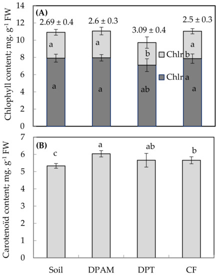 Data are summarized in Figure 2. Results showed a strong predominance of chlorophyll a (Chlr a) over chlorophyll b (Chlr b), independently of the treatment (Figure 2A). Total chlorophyll contents were higher in plants cultivated on DPAM and CF than in those on Soil and especially on DPT. The Chl a/b ratio was significantly affected by the substrate (Figure 2A). This was the most important with DPT and the lowest with CF substrate. Regarding carotenoid pigment (Figure 2B), there was variability between the studied substrate. This was more accumulated with DPAM substrate as compared to DPT and CF. On soil substrate, it was the lowest content of carotenoid.