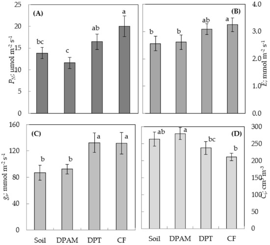 The photosynthetic activity was estimated by the net assimilation rate (PN) according to changes in CO2 content in inflowing and outlet gas flow during the measurement. Results showed that the most important photosynthesis rate was observed in plants cultivated on CF substrate in the range of 20 µmol m−2 s−1 (Figure 3A). This activity was significantly reduced with the substrate and was only 13.8 µmol m−2 s−1 with soil and 11.5 µmol m−2 s−1 with DPAM substrate.